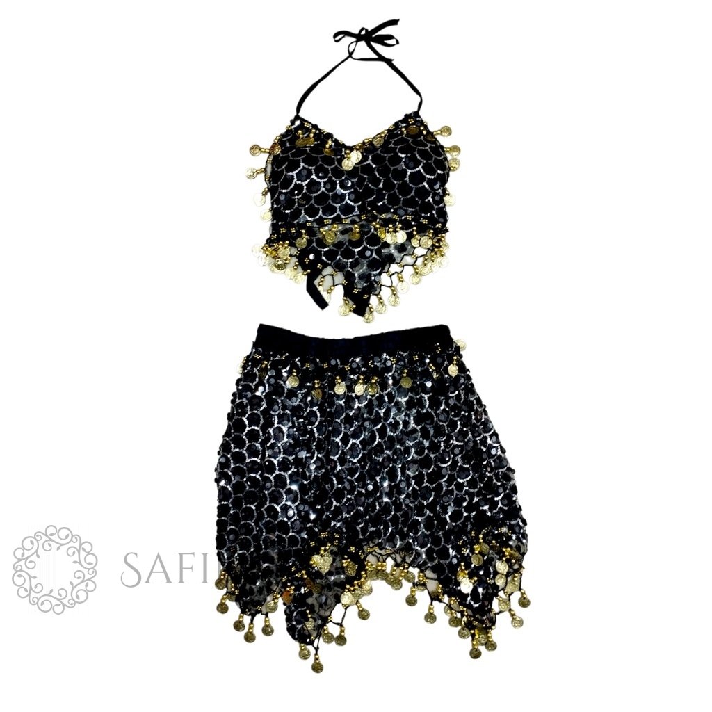 Úžasný dětský kostým Ráchel pro malé orientální tanečnice v černém provedení. Vhodný pro holčičky výšky přibližně 100 až 125 cm. Kostým se skládá z topu a sukně. Oboje je vkusně ozdobeno flitry. Na topu jsou tři řady zlatých penízků, které jsou připevněny háčkovaným lemem. Je tak zajištěno, že penízky neodpadávají. Top je za krkem a na zádech na zavazování, lehce se přizpůsobí různým velikostem. Sukně má po okraji ozdobný háčkovaný lem se zlatými penízky.
